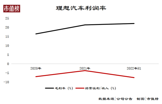 一直以来,理想都是最接近盈利的新能源车企:理想的毛利率是造车新势力中最高的,到2021年已经超过20%。