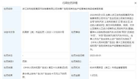 今年5月,吉利汽车在公司官方媒体上发布了旗下汽车与本田、丰田车型对比的内容,后经杭州市高新区(滨江)市场监督管理局认定,该内容构成利用广告贬低其他生产经营者的商品的行为,责令吉利汽车停止发布广告,消除影响,并罚款人民币10000元。