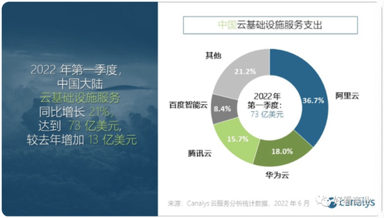 根据Canalys 发布的中国云计算市场报告,2022年Q1,百度智能云市场份额为8.4%,在与阿里云、华为云、腾讯云组成的“中国四朵云”中份额最小。