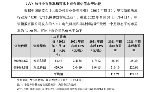 实际情况是,安克创新2021年扣非前后的净利润对应的市盈率分别为25.44倍和35.3倍,而派能科技2021年扣非前后的净利润对应的市盈率则均高达200多倍。华宝新能可比公司的平均市盈率主要是被派能科技所抬高的。