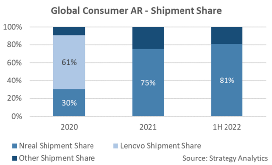 事实上,从Nreal的发展史不难看出,Nreal是上一波XR大潮下为数不多能活下来的创业公司。根据StrategyAnalytics最新发布的报告称,Nreal在消费级AR终端领域处于主导地位,其2021年的市场份额达到了75%,今年上半年增长至81%。