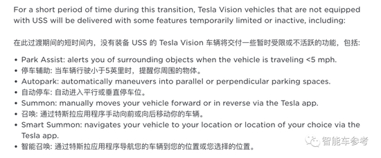 但是!在过渡期内,取消掉超声波雷达的特斯拉交付车辆会有一些小功能受限——