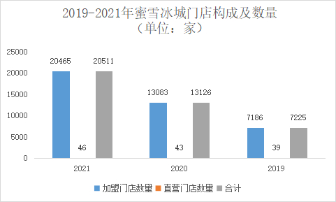 从招股书中可以了解到,蜜雪冰城的收入快速增长主要是因为门店数量的倍增和单店销售额的提升。2019年,蜜雪冰城门店总数为7225家,其中直营39家,加盟店7186家,彼时加盟店铺占比已经达到了99.5%。到了2021年,其门店总数更是翻了近2翻达到20465家,加盟店占比更是高达99.8%,也就是说,这三年来直营店铺扩张了不到100家,而加盟店新增了1万多家。以2021年的销售情况可以看出,加盟店贡献了95%的收入。