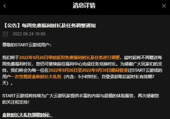 今年9月24日,腾讯START云游戏官方发布公告称,自9月26日起不再赠送每周免费时长。