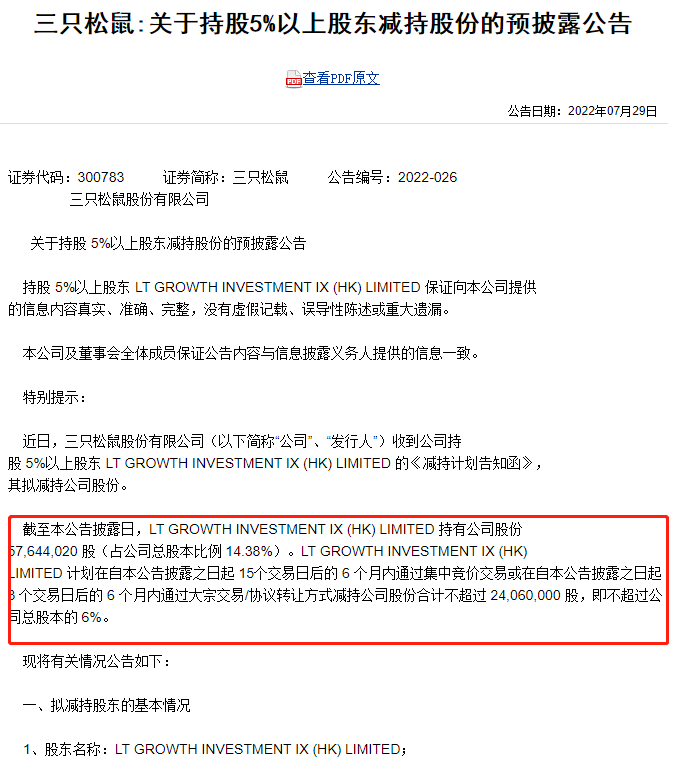 受此影响,大股东IDG资本和今日资本开始不断套现,据三只松鼠在2022年7月29日发布的公告可知,股东LT GROWTH INVESTMENT IX(HK) LIMITED因自身资金需求,拟减持股份数量合计不超过2406万股,减持的股份超过总股本的5%,但不超过三只松鼠总股本的6%。若以7月29日减持当天21.42元的股价计算,本次减持套现总金额为5.15亿元。