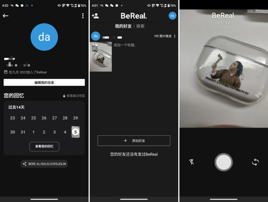有别于Instagram刻意营造的精致美,BeReal的产品理念是鼓励用户做真实的自己,分享一些不加滤镜、没有美颜的日常照片,甚至会在功能上进行一些限制:用户只能在随机的时间里拍摄照片,必须同时打开前置和后置摄像头,必须在两分钟内拍照上传。