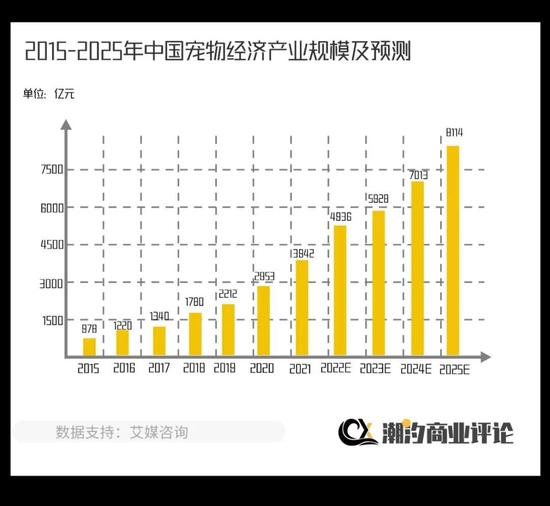 根据《2021年中国宠物行业白皮书》数据显示,2021年全国城镇宠物狗和宠物猫总数超过1.12亿只,艾媒咨询报告显示,2017-2021年中国宠物经济产业规模增长近2倍,直逼4000亿元大关;预计2022年这一规模将达4936亿元,同比增长25.2%,到2025年还将增至8114亿元。