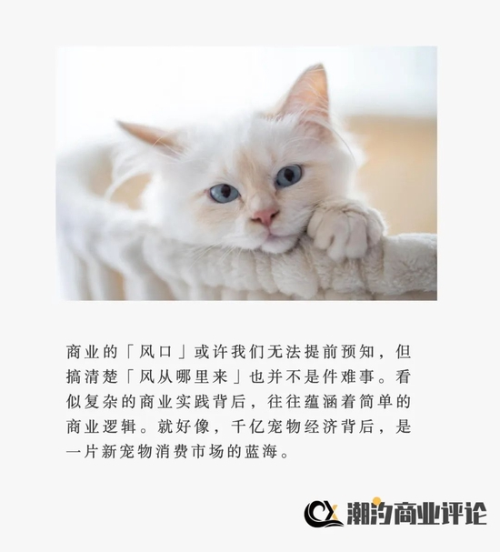 商业的‘风口’或许我们无法提前预知,但搞清楚‘风从哪里来’也并不是件难事。看似复杂的商业实践背后,往往蕴涵着简单的商业逻辑。就好像,千亿宠物经济背后,是一片新宠物消费市场的蓝海。