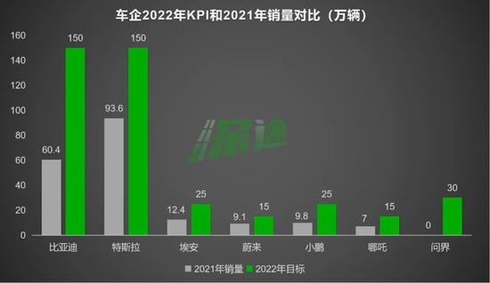 深途统计了明确公开2022年销量目标的车企,以下是它们2022年KPI和2021年销量之间的对比图。