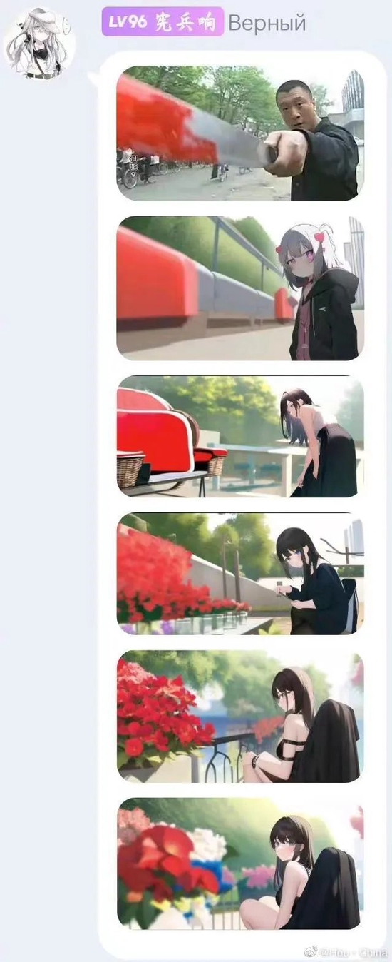 与此同时,还有不少人将各种经典梗图进行AI化,让网络流行文化充分融入新科技元素,刘华强、李云龙.....各种经典的网络形象被二次元化,在AI科技的加持下,人们体会着要素缝合带来的快乐。各种AI绘图梗也相继产生,最经典的是一个问答截图,一语解释了AI作画能够超越人类创作的原因:“因为你给它学习它真学”。