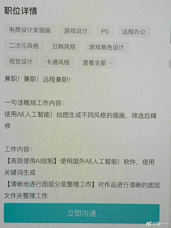 而事实上,整个设计、美术行业确实也在积极拥抱AI作画,现如今已经出现了AI绘图相关的岗位,在许多的相关讨论与梗图里,美术、设计等岗位都会首当其冲,成为被AI淘汰的首批从业者,而在游戏、动画行业,AI的运用也越发常见,很多业内人士认为,伴随着近期AI绘图的革命性发展,行业内部也必将发生天翻地覆的变化。