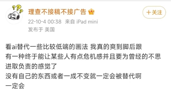 从绘画行业来看,无论是独立画手、漫画家、还是游戏原画师,都仍旧是劳动密集型产业,非常依赖“人才”资源,而AI的入局必然会对行业内的部分画师产生冲击。在AI高水平的画作之下,大部分腰部以下的画师都面临着非常直接的威胁。AI作画爆火后,不少画师就表达了焦虑,这不仅是一种优胜劣汰,更蕴含了创作者对于强大科技之下竞争失衡的无力。