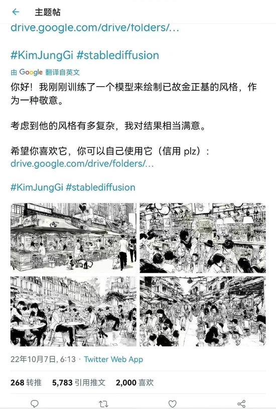 同时AI作画领域也乱象丛生。2022年10月4日,韩国知名艺术家、漫画家金政基在巴黎去世,震惊了全球绘画美术行业。在无数人悲痛之余,有人在推特上po出了自己通过AI创作的金政基风格画作,此举引发了众怒,在大师刚刚离世之际就将其作品迫不及待的“喂”给AI,许多人认为这是一种不尊重。而对于AI产出的金政基风格画作,不少人也直言“只存其形未有其神”。