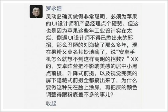 2022年9月8日,iPhone14发布。当晚,iPhone14刷屏各大热搜榜,但在果粉对“灵动岛”的一片称赞声之外,还有许多质疑的声音,比如前手机行业从业者罗永浩就发了条朋友圈,认为苹果的硬件设计和安卓阵营差距巨大。