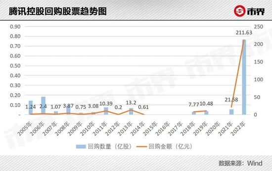 除此之外就是不断加仓的腾讯自己。市界统计,2005年以来,腾讯在14个年份都有回购记录,其中大多年份的回购金额都控制在13亿元以下,但2021年和2022年回购金额分别达到21.58亿元和211.63亿元,后者相当于腾讯控股2022年一季度的净利润规模。