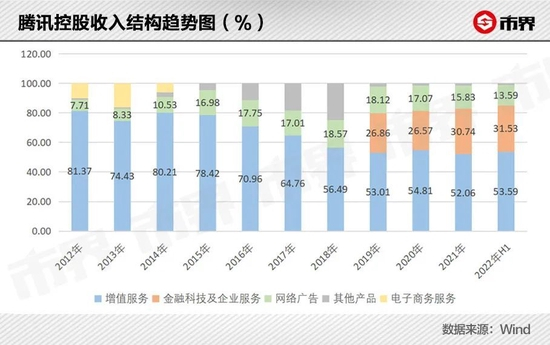 当前腾讯收入主要来自增值服务、金融科技及企业服务、网络广告三个部分,2022年上半年,三个业务板块分别带来收入1444.21亿元、849.76亿元和366.26亿元,同比增幅分别为-0.02%、5.01%和-17.98%。