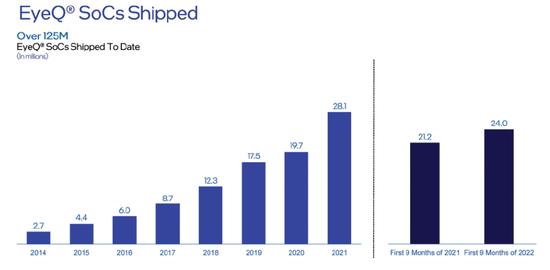 今年的前9个月,Mobileye的销量为2400万片,按照这个增长情况,2022年大概率会超过去年的水平。