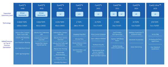 自EyeQ4之后,Mobileye芯片推出的速度和工艺,都较之前有了肉眼可见的提升。