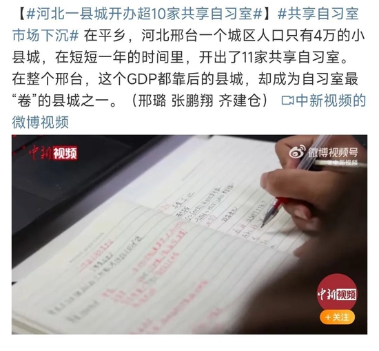 而近日,“河北一县城开办超10家共享自习室”的话题冲上微博热搜,再次将这个原被认为已经退潮的行业拉回了公众视野。
