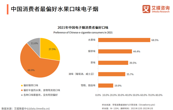艾媒咨询数据显示,2021年中国电子烟消费者偏好的具体口味中,68.5%消费者选择水果味,44.4%消费者选择烟草味,39.5%消费者选择茶味,35.7%消费者选择酒味(葡萄酒、威士忌),19.9%消费者会选择雪糕、甜品味。
