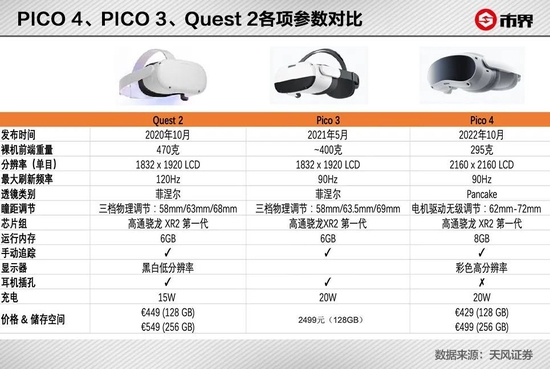 VR业内人士向市界评价,PICO 4配置均衡,总体言而比较优秀。市界走访了北京线下体验店试玩。从佩戴来看,PICO 4达到了轻便舒适。在早先VR产品普遍存在的晕头问题上,有了明显改善。通过试玩店家推荐的乒乓球游戏和剧情类游戏,有较好的沉浸感。