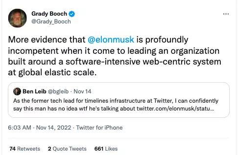 软件工程师届的传奇人物 Grady Booch 也加入了争论,其表示从这次的情况来看,“有更多证据表明,马斯克没有能力领导 Twitter 这样一家运营全球弹性业务、掌握软件密集型网络体系的组织。”