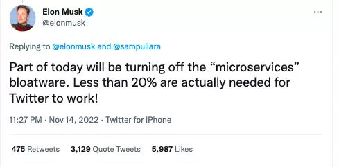根据 Frohnhoefer 的说法,Twitter 应用程序启动时,会发出大约 20 个后台请求。似乎是为了澄清自己最初的推文,马斯克随后回应说,“事实上,当有人使用 Twitter 应用程序时,你没有意识到有多达 1200 个‘微服务’被调用,这并不好。”