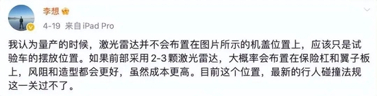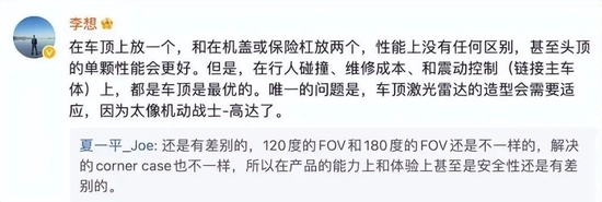李想表示,激光雷达放在车顶还是放在机盖和保险杠上,从性能上没有任何区别。但车顶激光雷达的造型需要适应。他表示,量产的时候,激光雷达并不会布置在机盖位置,大概率会布置在保险杠和翼子板上,风阻和造型都会很好,虽然成本很高,但是合规范围内只能这么做。