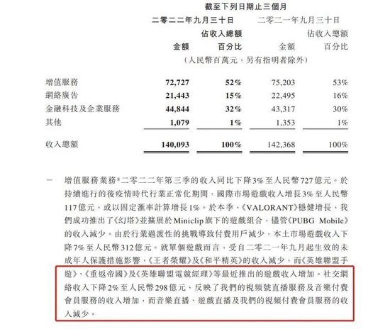 受大环境等综合因素影响,第三季度,腾讯全线承压。从《王者荣耀》到腾讯视频,再到企业服务,腾讯曾经的赚钱机器几乎全线失灵,对应的增值服务业务、广告业务、企业服务业务全面下滑。