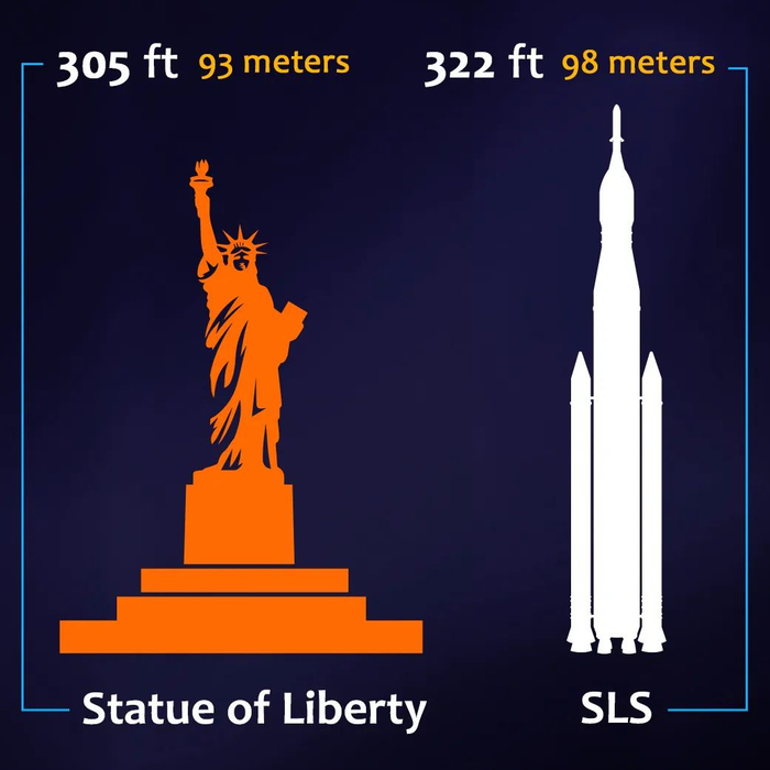 SLS 是 NASA 设计的重型运载火箭发射系统,推进器基于航天飞机,并且取代了这一已经退役的发射系统。SLS 的高度和美国“自由女神像”相近(见下图)。美国计划使用 SLS 来发射未来10年内的外层太空探索任务,直到更新、更大、更强的新火箭的问世。