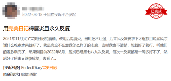 截至目前,黑猫投诉上有关完美日记投诉量有357条,包括但不限于“飞粉”、“涉嫌篡改生产日期”、“口号断裂”等品质品控问题,甚至有致病的情况出现。今年8月,有消费者反映,用过完美日记唇釉后得了唇炎,并且反复发作,看过医生后才得知,无法完全治愈。这已经不是小小的产品质量问题了,它带来终身性影响。