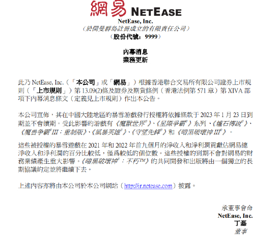 暴雪娱乐于11月16日发布声明称,由于同网易的现有授权协议将在2023年1月23日到期,将暂停在中国大陆的大部分暴雪游戏服务,包括《魔兽世界》《炉石传说》《守望先锋》《星际争霸》《魔兽争霸III:重置版》《暗黑破坏神III》和《风暴英雄》。不过,《暗黑破坏神:不朽》的共同开发和发行“涉及两家公司另外的单独协议”,不会受到影响。