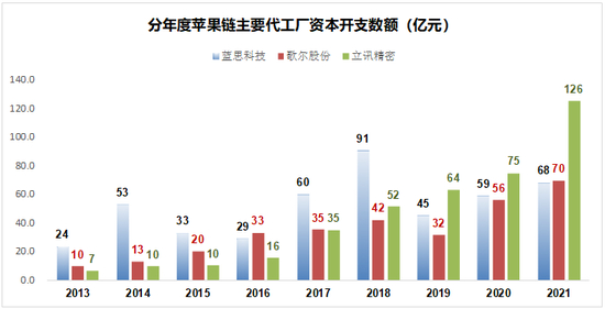 这其中2021年立讯精密的资本开支高达126亿元,歌尔股份和蓝思科技也有70亿,这个数字基本上相当于他们年净利润的2倍左右。