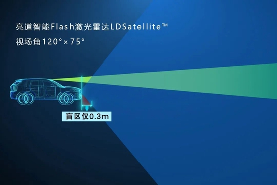 以亮道智能发布的Flash激光雷达LDSatellite™系列参数为例,视场角120°×75°,安装于车头或车身两侧位置时,视觉地面盲区小于0.3m,可以精准探测到各类车身近距低矮物体,能够最大限度地帮助车辆消除因感知盲区产生的CornerCase。