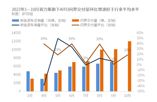 BT财经用AITO问界的交付量环比增速和全国新能源车销量环比增速(中汽协数据)比较发现,除了5月增速跑输大盘(主要因为后者在低基数上反弹),年内AITO问界增速几乎均好于、或至少持平于行业平均水平。