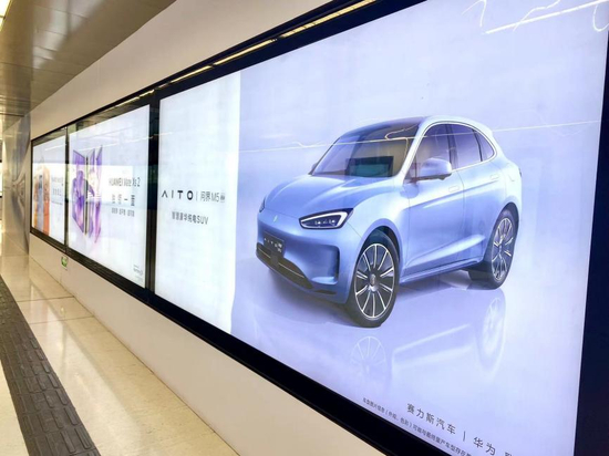 BT财经也在北京最热闹的地铁站看到华为广告,AITO问界M5 EV的广告和Mate系列手机并肩展示。