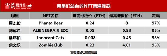 潘玮柏、陈冠希、余文乐等明星站台发行的NFT,也都经历了大起大落,截至目前均较高点跌超95%。