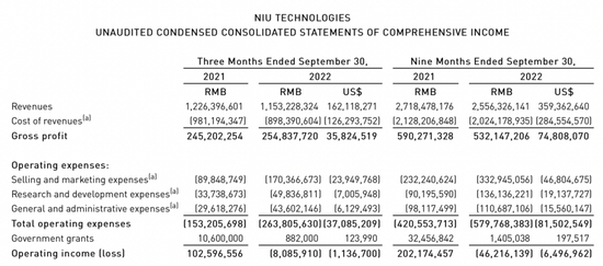 11月21日,小牛电动发布了2022年第三季度财报。财报显示,第三季度营收为11.532亿元,较上年同期下滑6.0%;净利润为290万元,而上年同期为9170万元,同比下滑96.83%。