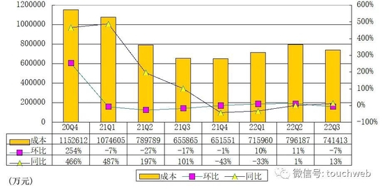 拼多多2022年第三季度成本为74.14亿元(约10.42亿美元),较上年同期的65.59亿元增长13%。