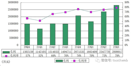 拼多多2022年第三季毛利280.9亿,毛利率79%,上年同期毛利率为70%。