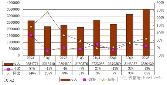 拼多多2022年第三季度营收为355亿元(约49.91亿美元),较上年同期的215.1亿元增长65%。
