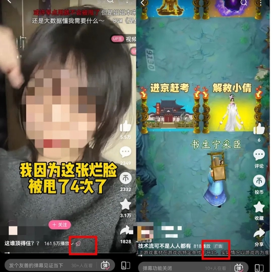 不过,目前B站的Story-Mode竖屏视频在广告形式上相比抖音快手还略显单一。据AI蓝媒汇亲身试验,在顺序播放的100条短视频中,标注为“广告”及带有“小火箭”标志的软广视频数量为8条,广告方向主要是游戏、小家电、配音剪辑等。