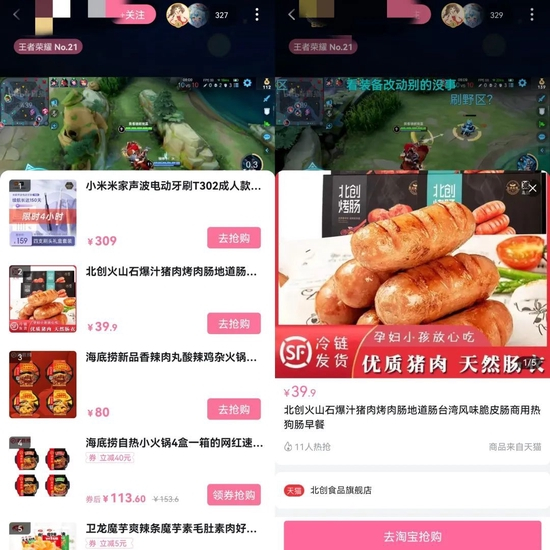 AI蓝媒汇观察到,在B站的直播购物分区中在线观看人数最高的一个直播间种,主播的直播内容为王者荣耀手游,下方的小黄车只是挂上了20个链接,但在将近30分钟的时间里,主播均未提及与直播带货相关的内容。同时,点开小黄车发现,许多购物链接抢购人数并不多,并且链接显示“商品来自天猫”。