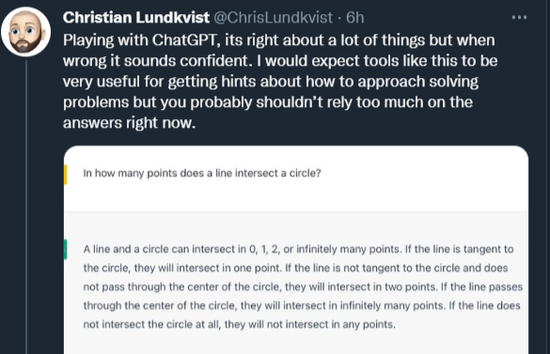 (在回答“一条直线与圆有多少个交点”这个问题时,ChatGPT 就错误地以为当直线穿过圆心时会有无限个交点。)