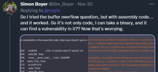 “我给它发了一段汇编语言代码,让它告诉我里面有什么漏洞,可以怎样利用——结果它还真的回答我了。所以它不光能够理解和输出代码,还可以用二进制来表达,并且还能从中找到漏洞?这真让我有点担心了……”