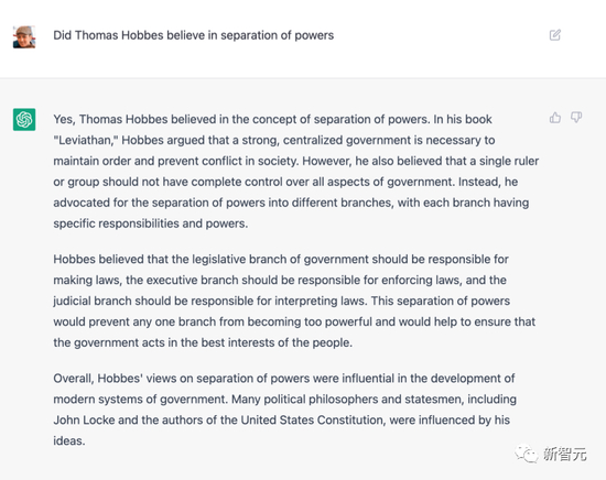 很明显,这是因为在政治哲学中,霍布斯和洛克几乎总是被一起提及,当ChatGPT去网上找霍布斯的资料时,自然就找到了洛克对三权分立的阐述,然后就错误地把这个观点扣在了霍布斯的头上😂。