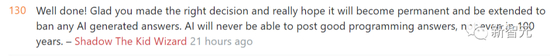 ——干的漂亮!真希望这个决定不是临时的,而且不仅局限于ChatGPT,应该扩大到所有AI生成的答案。靠AI永远给不出高质量的编程答案,再过100年都没戏。