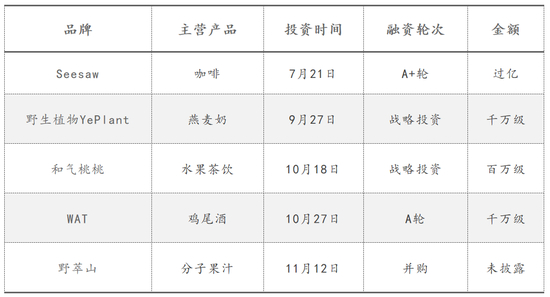 值得关注的是,早在去年下半年,新茶饮品牌们就已开始充当起了“VC”的角色。其中,喜茶先后投资咖啡品牌Seesaw、植物基品牌野生植物Ye Plant、预调酒饮品牌WAT鸡尾酒、茶饮品牌和気桃桃和野萃山分子果汁。
