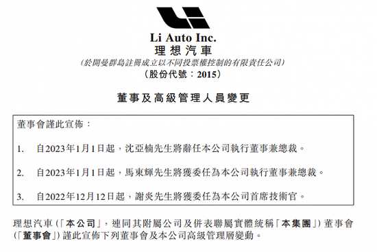 理想汽车管理层调整公告