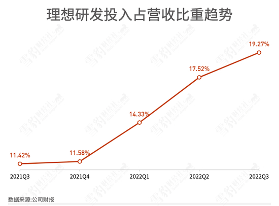 其次,净亏损加大与研发成本的飙升也有较大关系。财报显示,理想汽车第三季度的研发费用达到18亿元,较2021年第三季度的8.885亿元增加103.1%,较2022年第二季度的15.3亿元增加17.8%。而最近5个季度,理想的研发收入占营收的比重从11%一路攀升到了近20%。
